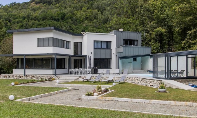 Villa on 2 levels comprising on the ground floor: an entrance with wardrobe and shoe cupboard, a laundry room, separate WC, a living room (Smart connected TV, suspended fireplace), and a kitchen-living room opening onto the terrace, a bedroom PMR for people with reduced mobility with bathroom with shower and WC (Emeraude: 1 double bed 160x200 cm). 1st floor: 5 bedrooms with private bathrooms with shower and WC (Jade: 1 double bed 160x200 cm; 1 single bed 90x200 cm / Onyx: 1 double bed 160x200 cm; 2 bunk beds 90x200 cm / Amethyst: 1 double bed 160x200 cm / Ambre: 1 double bed 160x200 cm / Saphir: 1 double bed 160x200 cm), games room (billiards, table football and board games) opening onto a terrace (spa). Garage only for bicycles, skis or motorcycles with a bathroom (shower and WC). 80 m² terrace with bioclimatic walkway, garden with ponds and pétanque court. Swimming pool with retractable shelter heated all year round. At the foot of the Col de la Madeleine, detached villa located on a 3000 m² property on the edge of the forest, with heated swimming pool covered with a retractable shelter (8x4x1.50 m), spa for 4 people outside on a terrace, a 80 m² terrace with plancha and outdoor dining area and sun loungers, garden with 2 ponds, pétanque court, billiards and table football. Garage for bicycles and motorbikes. All-inclusive services. Property located next to the owners' house. Video surveillance system (garage, swimming pool, games room and exteriors)