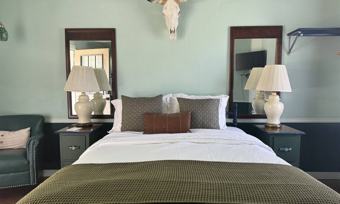 Come stay in the quaint town of Christoval, TX and enjoy the peaceful South Concho River, walk our charming Main Street to one of the several local businesses, and relax on your private patio overlooking our quiet grounds. The Mesquite Room features an outdoor theme, queen-sized bed, a kitchenette, and private bathroom.