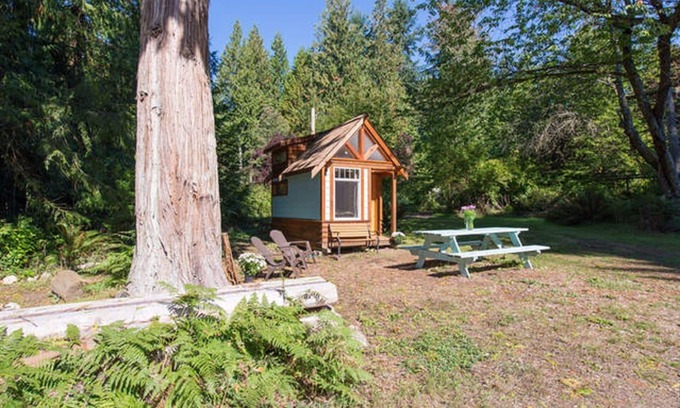 As featured in Canadian Living magazine, Cottage Living magazine, and on the 604now's Bucket List for 2017, the Micro Cabin is nestled on a heritage homestead surrounded by lush garden and towering cedars. The ocean and the heart of Roberts Creek are two minutes away. We are located halfway between Gibsons and Sechelt, making it a perfect homebase to explore the Sunshine Coast from. Enjoy a solo retreat or a relaxing getaway for two while trying out tiny house living!