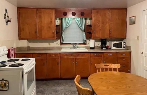 Arrive at the crest of a hill to a front porch where you can dry you boots. Two bedrooms upstairs one with a firm and one with a soft mattress freshly made for you. A large Gathering/ Living room downstairs with couch and recliners is great to enjoy present company or our fast WiFi and internet TV. Then step down to an full kitchen for light cooking and coffee. Laundry and dryer are available in the adjacent cozy bathroom. The backyard has a shed/ bar with a view atop a hill. Two off-street parking spots directly in font of house and free parking downtown. Look up for the northern light or a star filled sky.