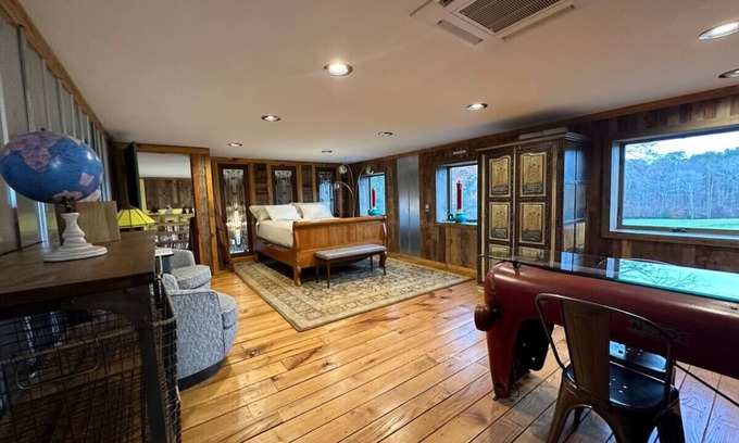 Two-Story Layout: The second-floor luxury bedroom boasts stunning views of the farm's side fields and includes a small wet bar.