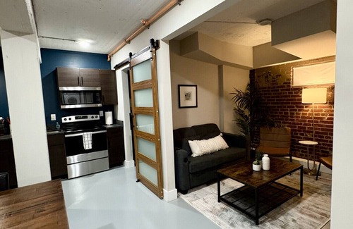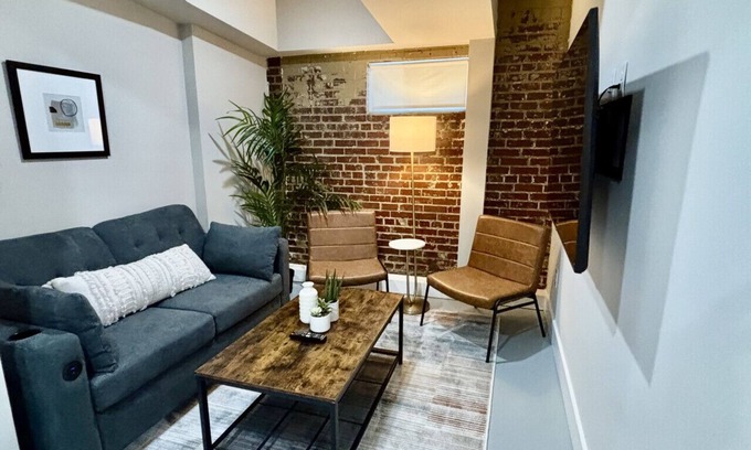 Experience downtown Huntsville like a local at The Monarch Downtown! Our largest 1-bedroom loft blends historic elegance with modern amenities. With 534 sqft of stylish space, this apartment features exposed brick, a comfy queen bed, and a full-size pull-out sofa—perfect for up to 4 guests.