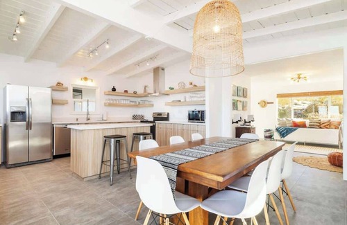 The property is quiet and secluded, yet also conveniently located just a quick, 5 minute drive into Joshua Tree Village. The Moondance: Joshua Tree is a fully re-imagined original 1961 mid-century former horse ranch estate inspired by the natural landscape and music history of the region. Each detail of our home has been carefully curated fusing modern and vintage, minimalist and organic, and our design choices have been inspired by our passion for creating a space where our guests can experience ‘hygge’ in the high desert.