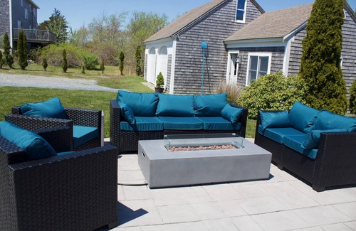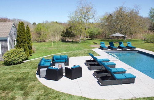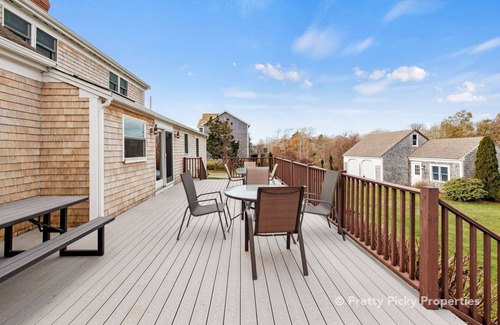 You couldn't choose a better vacation location for your group of up to 12. Here, you're a mere six-minute walk away from sandy South Village Beach on Nantucket Sound. Or drive only three minutes to the larger West Dennis Beach. It takes even less time to walk out to the back yard and jump in the heated, in-ground pool.