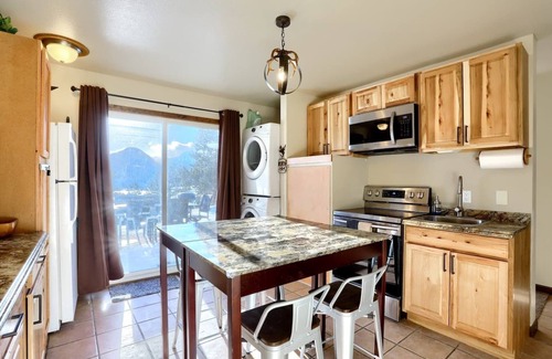 A fully equipped kitchen makes home cooking simple, with a range, oven, microwave, refrigerator, freezer, coffee maker, toaster, hot water kettle, and cookware provided. Basic staples like oil, salt, and pepper are included. Enjoy meals at the dining table or bring them outside to the fresh air, where outdoor furniture and a grill space allow for relaxed mountain dining.