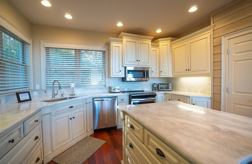 The clean and bright white kitchen with white granite counter tops make it a pleasure to spend time in the kitchen. The cottage style dinner table has room for 10 family members and friends. There is also a six person and a two person table on the deck if you prefer to dine outside.