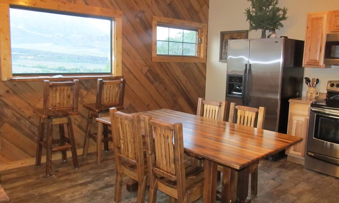 Only 25 miles from Yellowstone National Park and 25 miles from Cody. Stunning views out all five windows! This lovely cabin rental can accommodate up to six guests in two bedrooms. One bedroom has one queen bed. The second bedroom has a full/twin bunk. All beds are equipped with high quality linens. DirecTV, and internet. In the main living space, guests will find a fully-equipped kitchen which comes complete with a large refrigerator a stove.