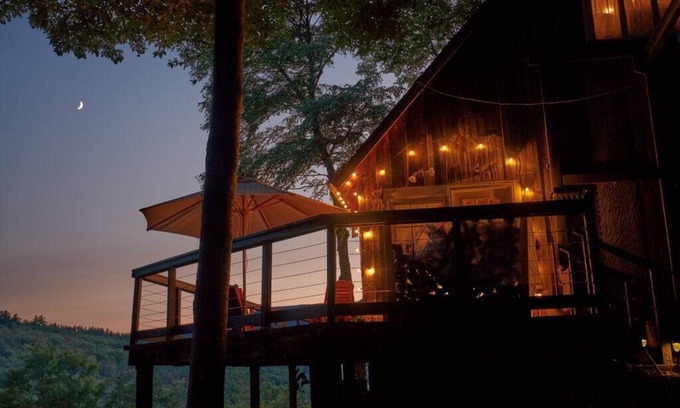 The ideal cabin for a true mountain getaway: Greatest view in the Catskills; natural wonders include private river & hiking forest; year-round amenities include a wood-burning hot tub & sauna. Warm & woah is the vibe.