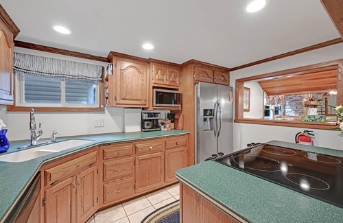 Inside, you'll find a bright and airy living room with plenty of seating, a large flat-screen TV, and a cozy gas fireplace. The living room also features a wet bar with ample seating; a great space for entertaining guests or relaxing with a drink. The adjacent dining area features a large table with seating for eight, perfect for enjoying meals or playing games with family and friends. The kitchen is fully equipped with all the essentials, including an electric range, dishwasher, and plenty of cookware and utensils. We have a standard drip-brew coffee maker in addition to a Keurig coffee maker.