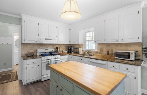 The Mulberry's main floor is perfect for hosting, with mid-day chats in the sitting room, evening movies on the TV, meals in the dining room, and any-time games. Our full kitchen with stove, dishwasher, and plenty of counter space has all the basics for cooking up a delicious meal, serving up take-out, making coffee, and organizing snacks. But, your favorite spot of the house might just be outside on the screened-in porch or relaxing by the gas fire pit.