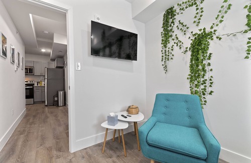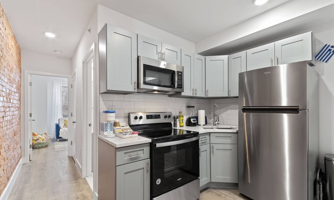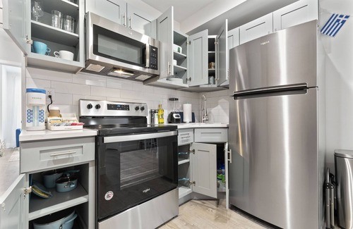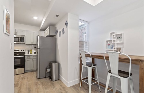 The ambiance is set for relaxation at our unique 2 bed, 2 full bath suite. Exceptional comfort and beautiful decor is all you need to complete your trip to Philly! Fast WiFi and free street parking are included for your convenience. Tell your partner to meet you in Mykonos!