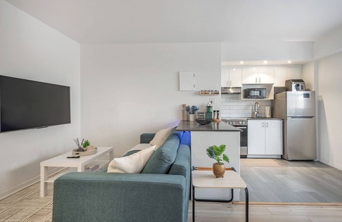 Welcome to your home away from home in the heart of Montreal. This bright and spacious one-bedroom apartment features an open-concept kitchen and living room, perfect for relaxing or working remotely. The fully equipped kitchen includes all the essentials to cook and dine in, with a dining table that comfortably seats four. Step out onto the private balcony to enjoy a morning coffee or evening breeze. The apartment also offers a well-appointed bathroom, high-speed Wi-Fi, and a smart layout for both comfort and functionality. Located in a secure building with elevator access, this space is ideal for couples, solo travelers, or professionals seeking a convenient and stylish stay.
