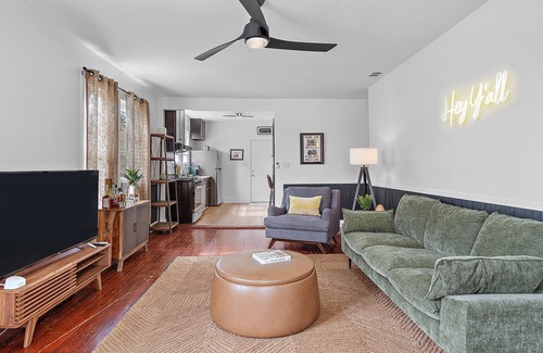 The full bathroom features funky hexagon tile floors and classic subway tile in the tub/shower combo as well as a hairdryer and some minor toiletries available that you may have forgotten. Laundry room provides free use of washer/dryer with detergent and fabric sheets provided. Iron/Ironing board also available.