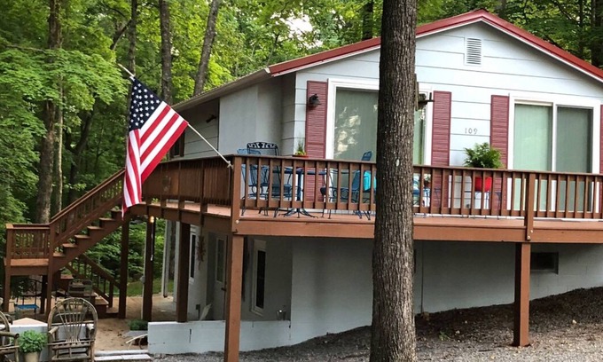 Nestled in the woods of Blue Springs Estates, this quiet, cozy cottage awaits your arrival. The No Wake Zone features two bedrooms, each equipped with a queen-size bed, a living/dining area, a full bath, and a kitchen on the main level. The lower level boasts a family area with additional sleeping quarters, complete with two twin beds, a full bath and laundry. The No Wake Zone proudly showcases a large private patio and surrounding decks, furnished with patio furniture and a fire pit, perfect for relaxation. Enjoy effortless access to Lake Barkley, with a convenient boat launch at the public boat ramp, eliminating the need to venture onto county roads after a day on the water. Outdoor enthusiasts will delight in this location, with its proximity to nature. The property's strategic location places it merely 10 minutes from the Lake Barkley State Resort Park, which offers an 18-hole golf course, trap range, fitness center with an indoor pool, and numerous hiking trails. The Marina provides boat slips for rent, as well as boat and jet ski rentals. For anglers, the public boat ramp is merely a short walk away, offering ample fishing opportunities. The Land Between the Lakes National Forest, a mere 15-minute drive, affords unparalleled access to nature, with its diverse range of trails, suitable for hiking, kayaking, or biking. A 45-minute drive will transport you to the renowned Patti's 1880 Settlement, where a delectable dinner awaits, followed by a leisurely stroll along the sidewalks of Grand Rivers. Cadiz, a quaint town steeped in charm, hosts various events and is celebrated for its exceptional antique shopping. The town also provides convenient access to restaurants and grocery shopping. Although The No Wake Zone is not situated directly on the lake, it does offer a seasonal lake view, ensuring an unforgettable experience. Don't miss the opportunity to revel in the splendor of autumn, with its mild weather. The property's proximity to major cities includes Murray, KY (32 miles), Hopkinsville, KY (29 miles), Nashville, TN (80 miles), Paducah, KY (40 miles), Owensboro, KY (109 miles), and Evansville, IN (110 miles).