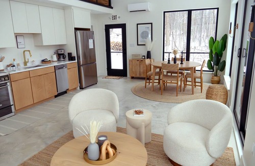 The highlight of The Nordic Nook is its abundance of large windows—designed to bring the outside in. Whether you're lounging on the couch or dining at the table, you'll be able to enjoy panoramic views of the forest, where the trees stretch endlessly, and the sounds of nature are all around you. The large glass doors lead out to a private deck, ideal for enjoying your morning coffee while listening to the rustle of leaves or for stargazing on a clear night.