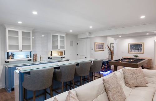 🥃 After a relaxing soak, head downstairs to your private speakeasy-inspired basement bar and entertainment lounge. With a mini fridge, wet bar, seating for four, and leather lounge chairs, it’s the ultimate night-in setup. Challenge friends to a game of pool or dive into nostalgia with arcade games — all while watching the 70" curved TV from the ultra-comfy modular sofa.