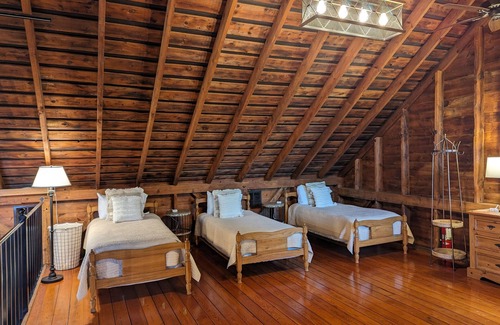 Our guesthouse is a 1880's barn that has been meticulously restored. The central portion of the guesthouse offers a rustic dining area, full kitchen, separate men's and women's restrooms. The loft has been converted into one spacious bedroom with a king bed and five twin beds. A double murphy bed is located downstairs in the large sunroom which boasts a breathtaking 270 degree view of the property.