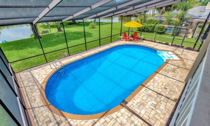 Waterfront 4 bedroom, 2.5 bathroom, pool home. Enjoy the waterside fire pit, barbeque, and picnic area with a swing set. This peaceful property is home to Florida's natural wildlife. Birds, turtles, fish, hawks, eagles, and alligators are a regular sight along with the occasional otter. Master bedroom has a balcony view of the pool and pond. The Master bathroom shower has dual shower heads, a walk-in closet, and dual vanity. 4th bedroom with balcony, pool, and lake views.
