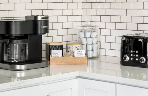 The fully equipped kitchen awaits the culinary enthusiast in you, ready to inspire delicious meals. Share family dinners around the dining table. Appliances include: coffee machine, toaster, blender, waffle maker, air fryer, and griddle.