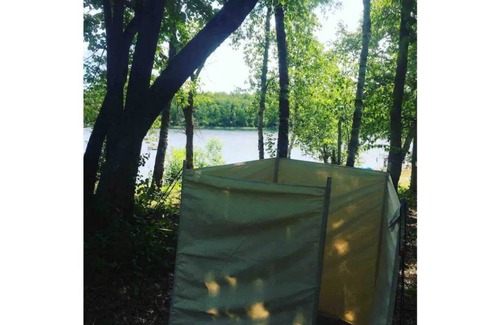 Amenities; Come stay in a top of the line luxurious bell tent fully furnished with modern style and comforts of home. Enjoy the modern conveniences of a flushable toilet, hot shower with giant skylight, and a one of a kind vanity all powered by the sun. Fancy your cooking needs on your personal grill with side burner.