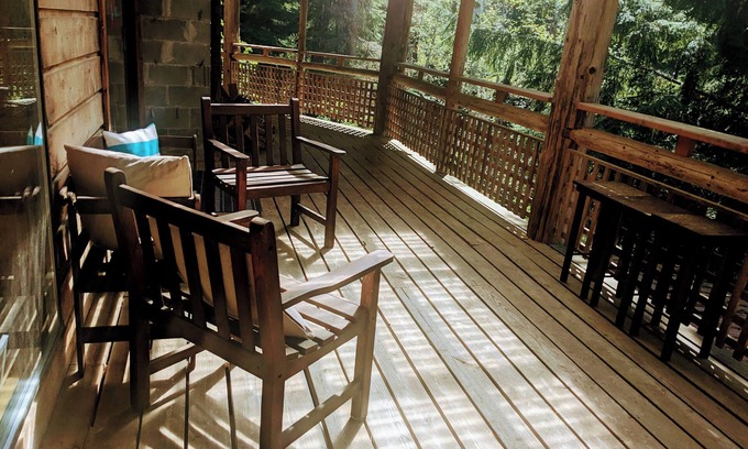 Relax and soak up the forest in our family's Lodge. The space, an intriguing mix of rustic and modern, looks over the creeks on the property. Cook for the whole group at the well equipped kitchen. You can WALK here from the ferry!