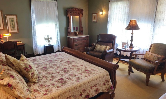 Beautiful upstairs master suite with attached bathroom and walk-in shower. To honor the legacy of the previous B&B and its charming hostess, "The Old Victorian" is beautifully appointed with Victorian eloquence, with a king bed, additional day bed, seating area, and desk. Additional conveniences include free Wi-Fi, an iron and ironing board, luggage rack, and basic toiletries, ensuring a hassle-free stay.