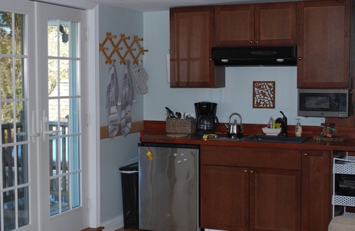 This newly updated suite is very private; located above our home. There are outdoor steps leading to its own separate entrance and little deck. It is well appointed with a small nicely equipped kitchen (Mini fridge, Elect. Cooktop, Microwave, Toaster Oven, Coffee Maker, etc.), great built-in table with banquette seating, comfy queen size bed with a wonderful reclaimed wood bedframe made by a New England craftsman, twin size sleeper sofa, wall mounted TV, and two closets with plenty of storage. The nicely sized full bath has a walk-in shower, along with a washer & dryer. A Mini Split AC/Heat System keeps the suite cool when needed in the Summer and warm and cozy in the Winter.