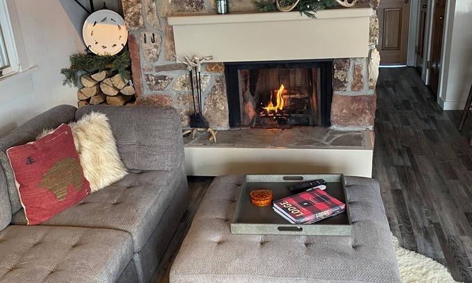 Downstairs, the cozy living area, wood burning fireplace and smart tv beckon you to gather and relax.