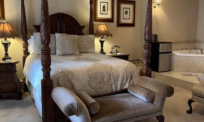 You won't believe your luck. The Overlook Suite features a private balcony, queen sized bed and luxurious linens, romantic Jacuzzi for two, with separate shower, a sitting area, Smart TV, and private parking downtown.