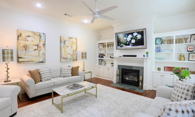 - Spacious living room with fireplace, SMART TV, and built-in cabinetry