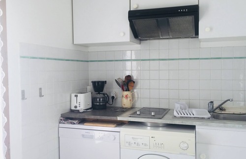 The entrance opens onto a living room with a small sofa, a table that can accommodate 4 people, a buffet, air conditioning, TV, box, wifi, a kitchen area equipped with a dishwasher, washing machine, multifunction oven, kettle, coffee maker, kitchen utensils, dishes, vacuum cleaner.