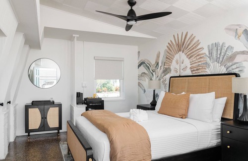 Stocked with Keurig coffee maker and pods, as well as a mini fridge, this room perfect for the on-the-go traveler. Enjoy the smart TV for entertainment, and our provided toiletries for your convenience. The Palm Room blends old-school nostalgia with modern comforts ensuring a memorable stay. Enjoy a hassle-free check-in experience with our contactless mobile check-in service, allowing you to start and end your getaway seamlessly. Just blocks from the beach and a short drive to historic downtown St. Augustine, our location is perfect for exploring the area.