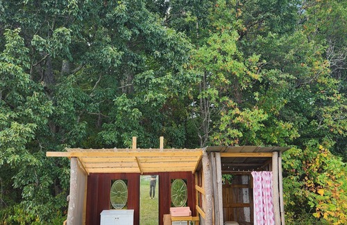 Sip your morning coffee on the front porch overlooking the neighboring valley and farm. While an outdoor shower is not available yet there is a composting toilet and handwashing station nearby. Fires in the neighboring firepit are allowed provided there isn't a drought. A public lean-to structure near the firepit is open for any desires to hang, eat, or cook under.