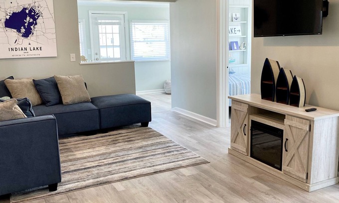 A short walk (less than a minute) from brand new public docks on the lake, restaurants and shops - we have created the perfect space for you to relax and enjoy all that Indian Lake has to offer. After spending the day on the water, sit back and enjoy a cocktail + conversation with friends and family in our beautiful front sitting room. Or spend time outside around the fire pit with ample seating and plenty of space for other outdoor activities, like corn hole. Starting to rain? No worries, as there is a large covered patio out back with plenty of comfortable seating.