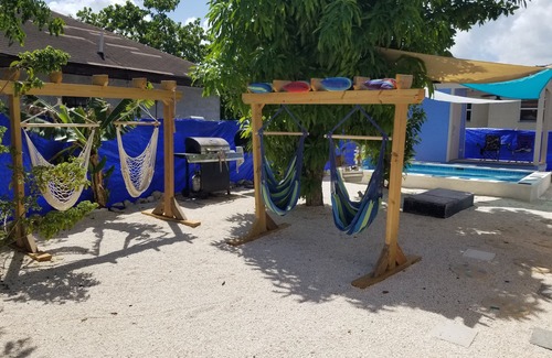 The lovely space provides a peaceful and private setting for the lucky couple staying here. Just walk outside your front door and you're ready to relax in the pool under colorful sun shades or lounge around and do nothing under the pergola!