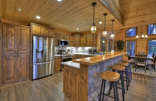 This spacious 3-story cabin is designed for the utmost in comfort and style. All four bedrooms are equipped with king-size beds, ensuring a restful night's sleep while you soak in the tranquility of the mountains.