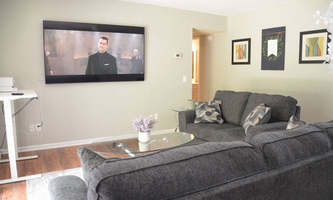 Your Enterprise adventure begins at this 2-bedroom apartment. Step inside this fabulous property and be greeted by a charming and quaint atmosphere. The bedrooms feature a comfortable king and queen beds, ensuring a restful night's sleep for all guests. With a washing machine & dryer, fully equipped kitchen, dedicated workspace, 75" & 55" smart TVs, you'll have everything you need for a delightful stay! Experience what the city has to offer as you are close to the key areas of Enterprise.