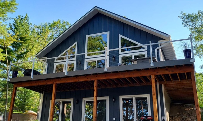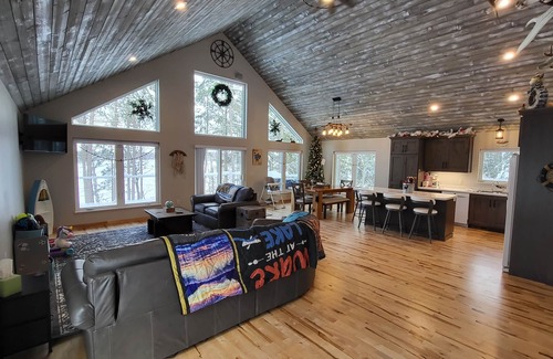 Welcome to our Waterfront Dream Home. We have poured our heart and soul into building an amazing place for families to enjoy. You know you are "up north" when you open the doors to wide open space, full of light, views of the lake, wildlife and nature. Once inside, you are met with the family gathering room and dining area and kitchen with island. The hand made maple floors and custom barnwood ceiling give way a wall of windows overlooking the 405 acre Big Bearskin Lake. A 600 sq.ft. elevated deck is all set up with a Blackstone Griddle and RECTEC pellet grill. Two full bedrooms with King beds round out the first floor.