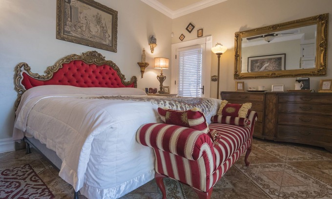 The Persian Superior Suite is truly a luxurious Gem and is filled with one of a kind Persian décor pieces. It is also surrounded by artwork on the walls from over 12,000 miles away. The room has a private entrance with a patio sitting area with chairs. It is one of our most luxurious rooms with a single person 6 Jet bathtub Jacuzzi and has 2 crystal chandeliers in the bathroom. You will also be in Tucson's most popular areas, The Entertainment district in Downtown Tucson.