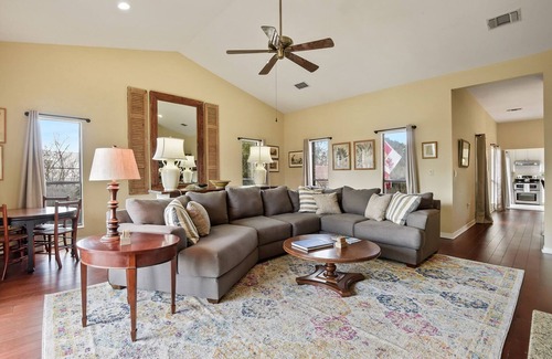 The living room is a warm and inviting space. There is a large sectional sofa, comfortable chairs, game table in the corner, and a flat screen TV with a DVD over the gas log fireplace. The living room connects to a spacious dining room. The dining room table has seating for eight people. These living areas are spacious and allow for natural sunlight.