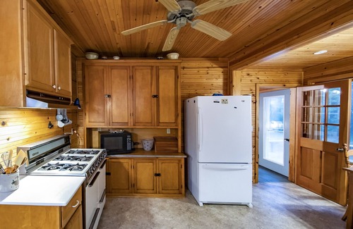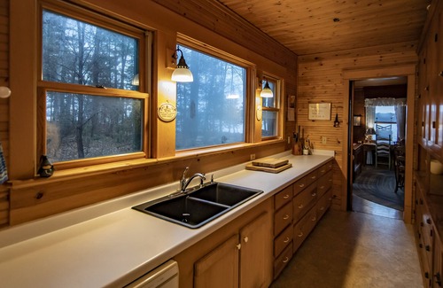 THE LAKESIDE PORCH INVITES ONE TO ENJOY YOUR BREAKFAST, CURL UP WITH A BOOK, OR SIMPLY ENJOY THE MAGNIFICENT LAKESIDE BEAUTY. THE LIVING ROOM CENTERPIECE IS THE HISTORIC STONE FIREPLACE. THE DINING ROOM IS STEEPED IN TRADITION. AS ARE THE WONDERFUL SUNROOM AND GREAT ROOM. THE HUGE EAT IN KITCHEN IS WELL STOCKED WITH AMPLE ROOM TO PREPARE DELICIOUS MEALS. ALL INTERIOR WALLS AND FLOORING ARE NATIVE AND LOCALLY MILLED PINE.