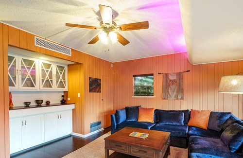 Imagine this: You pull up to The Pink Palace on a beautiful sunny day. You enter the home with our self check-in keyless entry to find that you have "Landed". You drop your bags and can't help but to observe all the little details that make the space unique. You take a seat on the cognac leather couch, and start admiring the tastefully curated Modern Art Deco interior design that was inspired by the homes' era. Looking over at the record player, you decide to select an album from our locally sourced collection, that would best suit the visual audio-scape of the moment.
