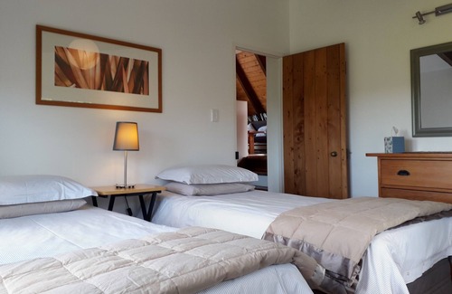The Loft is above a large disused timber barn. Built with hand milled timber it has extensive decks for outdoor living. The open plan living and dining area is spacious and comfortable with a fully equipped kitchen. There are two bedrooms, one with a queen bed and the other with two singles. There is a heatpump for the winter, a laundry and ample parking.