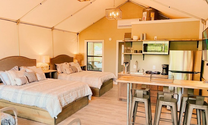 Brand new cabin on a gorgeous spring-fed creek near New Braunfels. Insulated and air conditioned of course, with 2 queen beds, 2 day beds, full bath, fully stocked and equipped kitchen and a brilliant, nature loving living area; the whole back wall actually opens to the outside for an indoor/outdoor living experience! The Cabin is elevated and nestled among beautiful Pecan Trees overlooking the creek bottom. Amenities include: Pool, hot tub, kayaking, paddle boarding, firepits, volleyball and more!