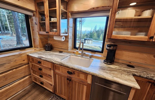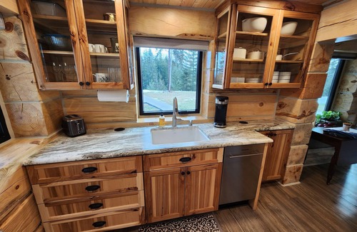 Unwind in Sandpoint at this unique beam tiny home. With WiFi, 2 antique radiators, a washer / dryer, flat iron,and a hair dryer available, guests can relax in comfort. This cozy retreat features a living room with a queen futon for additional space. Swing set play area, walking, & snow shoeing trails right outside your door. Enjoy breath taking views while sitting around the campfire, sitting in the hot tub, or while in the cozy cabin. We hope you enjoy what our place and Sandpoint has to offer. With other scenic play areas nearby, like Schweitzer Ski Resort, Caliber Disc Golf, or Pend Oreille Lake. This retreat shares a private access & drive with a log home residence in view. Access to bedroom is a custom ladder. Linens are mindfully washed in a nontoxic detergent, as well as the bathing products and choice of dishwasher detergents. The pantry is stocked with waffle mix, syrup,coffee and snacks.