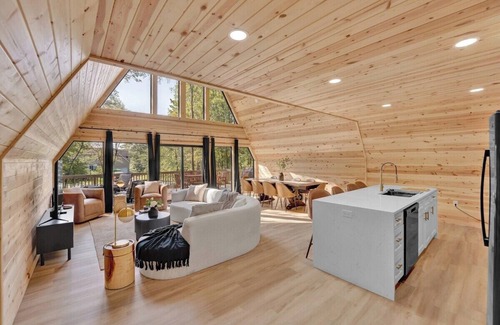 Step into a grand space with vaulted pine ceilings and an open-concept living area. Relax on the oversized couch or gather around the large dining table. The fully stocked kitchen has all the essentials you need to enjoy meals with the entire group. Not to mention an oversized dining table for 10, 4 barstools on the kitchen island, and another dining table on the front deck, there's plenty of space for everyone. Two cozy bedrooms on this level offer comfortable beds and forest views, just steps from a full bathroom.