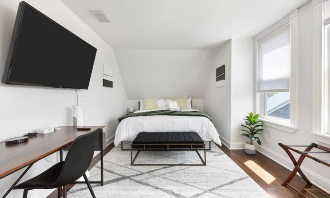 Want all the perks of a luxurious stay but don't want to spend an arm and a leg? Look no further than The Point State Room! This private bedroom in a beautifully renovated house sleeps two guests on a king size bed. Equipped with a digital door knob that gives you peace of mind when it comes to safety and privacy. Utilize the kitchen and living room as shared common areas to make friends, or make your way back up to your room for restful solitude. We've got you covered with a workspace as well.
