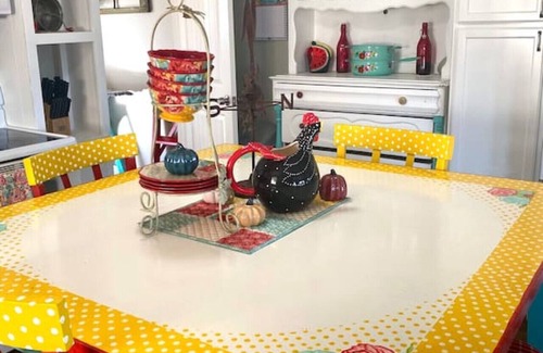 This space has a full kitchen, with white cabinets and a fun Polka Dotted counter height table, and a "in cabinet", pull out cutting board, just like grandma used to have.
