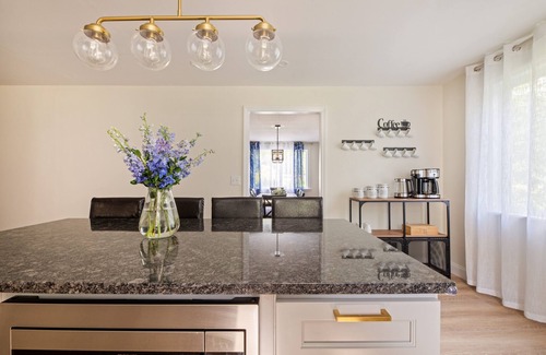 It is fully equipped with stainless steel cooking appliances that make it suitable for preparing any meal, whether a simple breakfast, quick snack, or a three-course gourmet dinner. Spacious granite countertops and the central kitchen island provide plenty of room to work your MasterChef magic.
