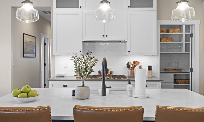 Designed and tailored for 8 guests, enter into the bright and airy great room with soaring 10-foot ceilings, where expansive windows frame captivating panoramic country vistas. Impeccably crafted engineered hardwood floors lead you to the gorgeous, fully stocked kitchen, just awaiting your culinary prowess. Enjoy your gourmet meal at the expansive dining table right off the kitchen. 4 meticulously appointed bedrooms include the primary featuring a king-sized bed, and ensuite bath with heated floors, a no entry shower, 2 sinks, a giant soaking tub and on demand hot water, through out. The 2nd bedroom, just off the primary, also features an en suite bath with a tub/shower combo and queen sized bed. On the opposite side of the home you’ll love the privacy of 2 more bedrooms, both with queen sized beds and a shared bath. If you need to do a little work during your visit, retreat to the den/office space equipped with a desk, printer and hi-speed wifi.